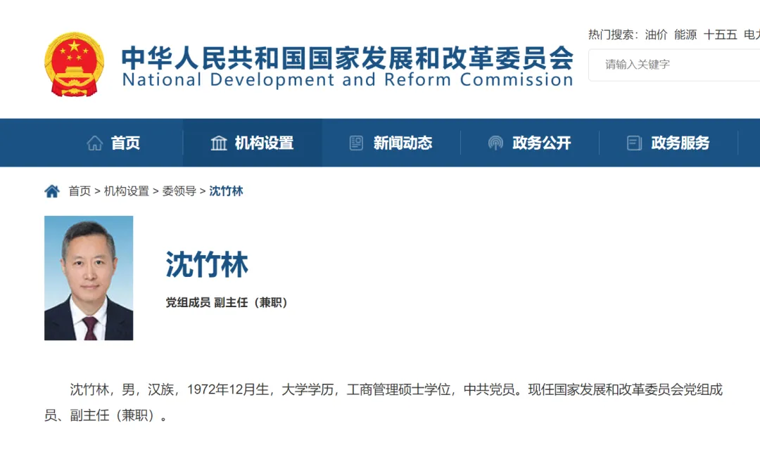 据国家发改委网站“委领导”栏目显示,沈竹林已任国家发展和改革委员会党组成员、副主任(兼职)。