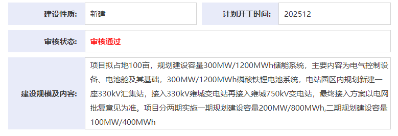 项目分两期实施,一期规划建设200MW/800MWh,二期规划建设100MW/400MWh,计划开工时间为2025年12月。项目初始投资单价约为1.50元/Wh。