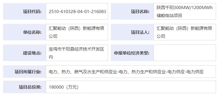 2025年10月10日,陕西千阳300MW/1200MWh储能电站项目通过备案审核。备案显示,项目总投资18亿元,建设地点为宝鸡市千阳县经开区内。