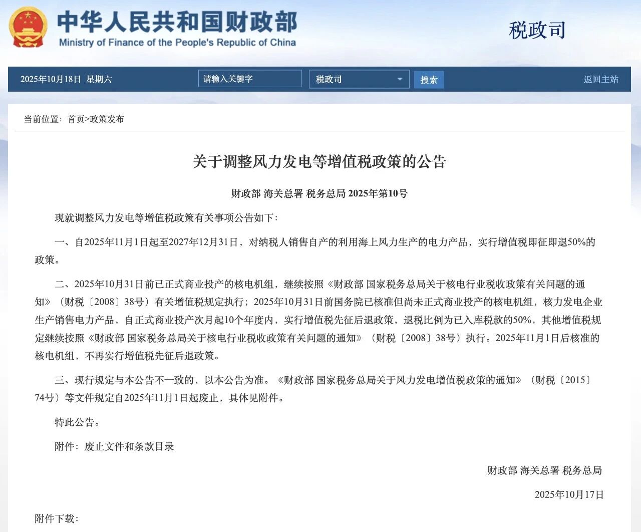 10月18日,财政部、海关总署和国家税务总局联合发布《关于调整风力发电等增值税政策的公告》。