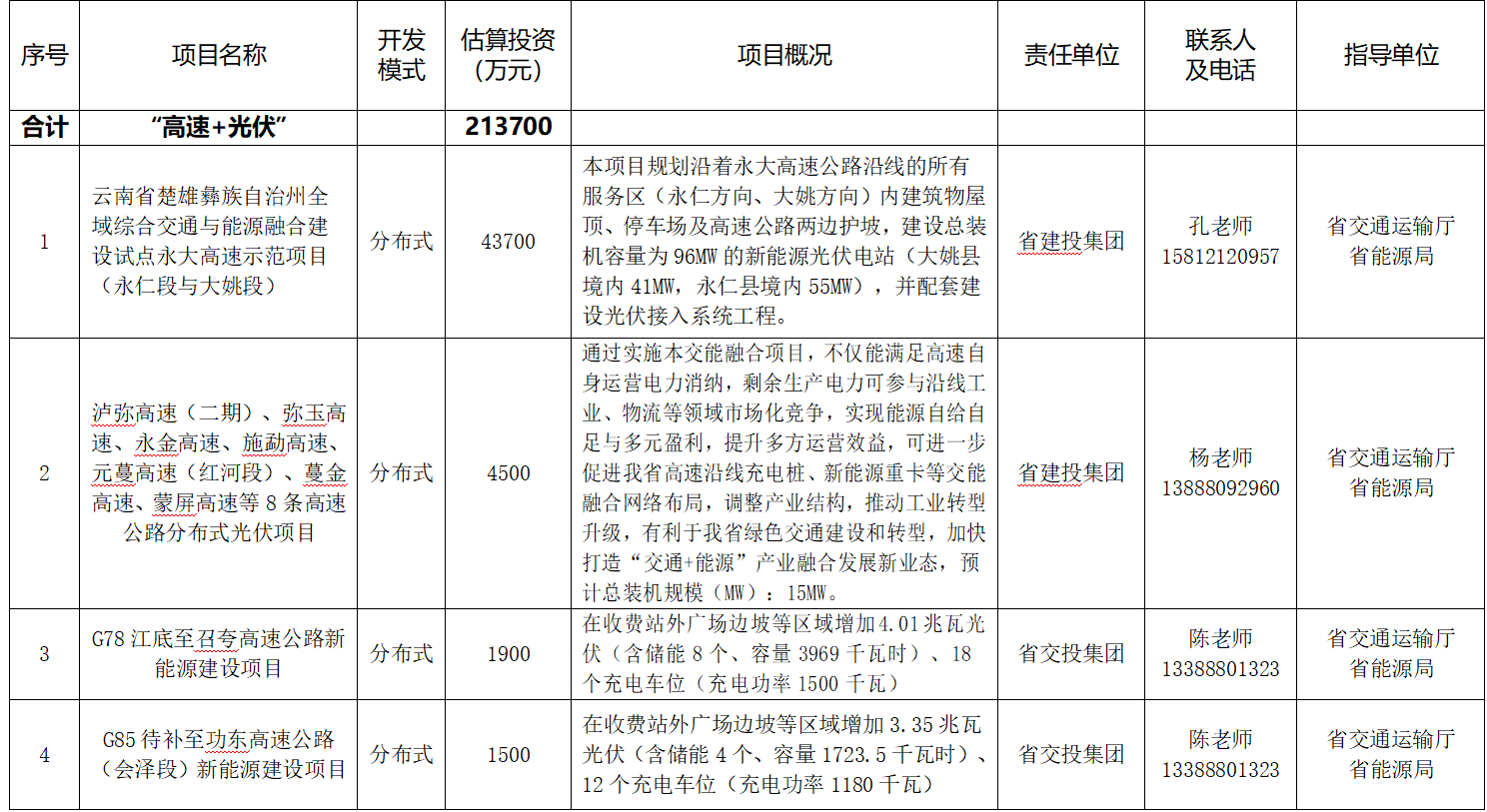 为加快释放《云南省推动高速公路融合发展若干政策措施(试行)》牵引效应,逐步推动高速公路融合发展成型起势,经州(市)谋划、专家评审、部门会商等程序,省发展改革委、省交通运输厅形成了《云南省第一批“高速+”项目推介清单》,现予公布。