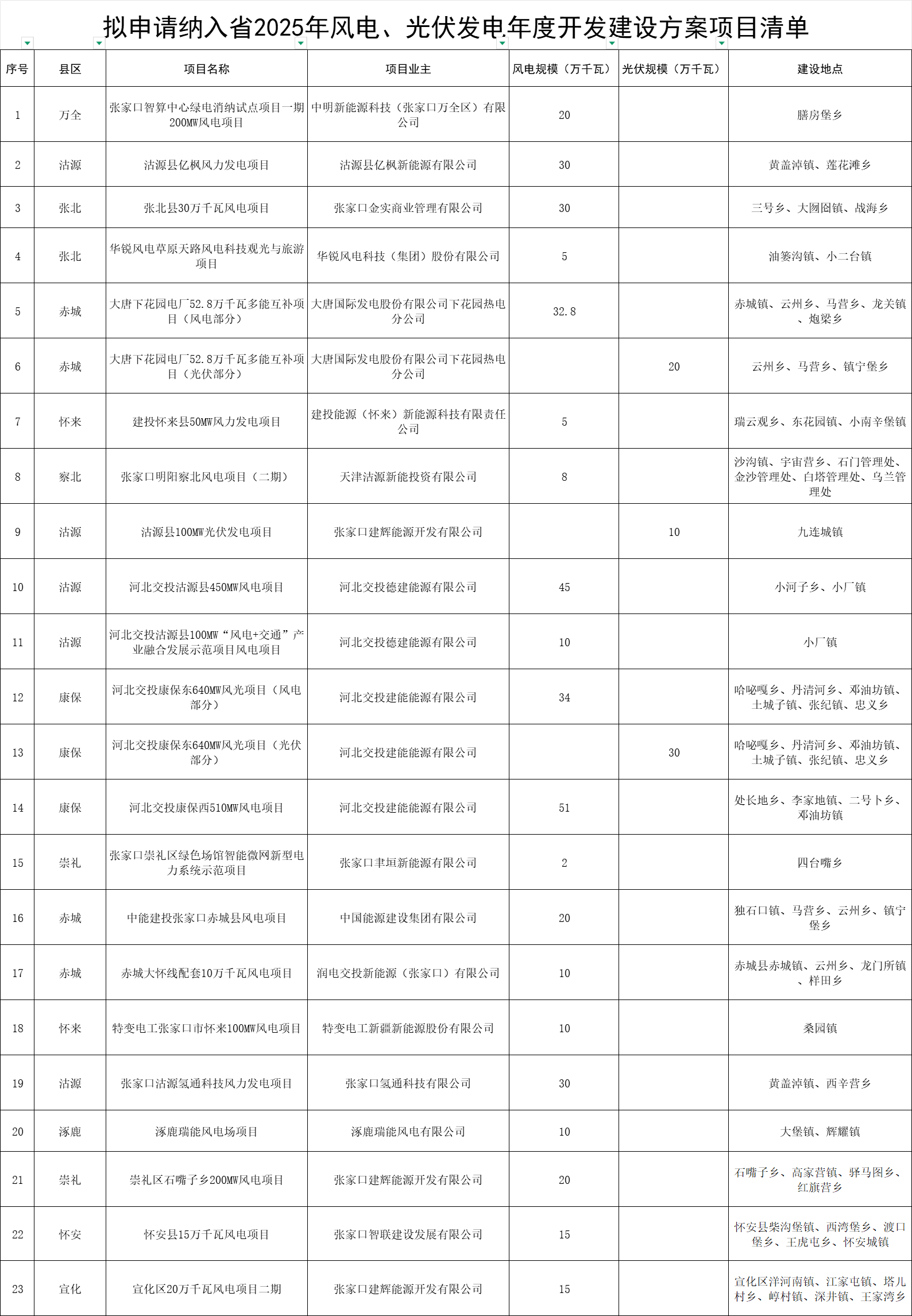 11月26日,河北省张家口市能源局发布《关于拟申请纳入省2025年风电、光伏发电年度开发建设方案项目的公示》。