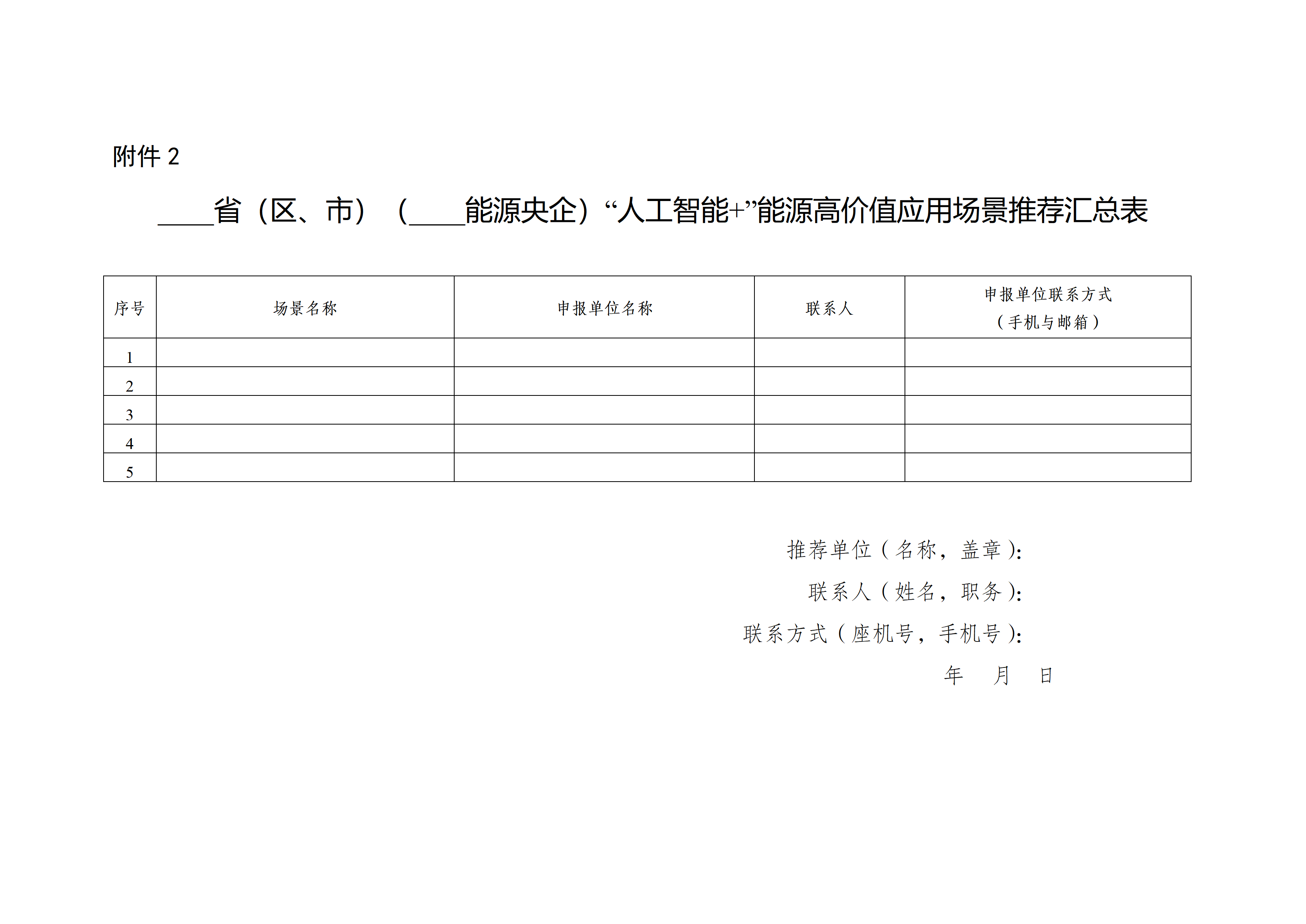 请各省级能源主管部门、中央企业于2025年12月29日前将高价值应用场景申报书(详见附件1)、推荐汇总表(详见附件2)盖章件一式三份纸质版及电子版(光盘刻录)寄送至国家能源局科技司。