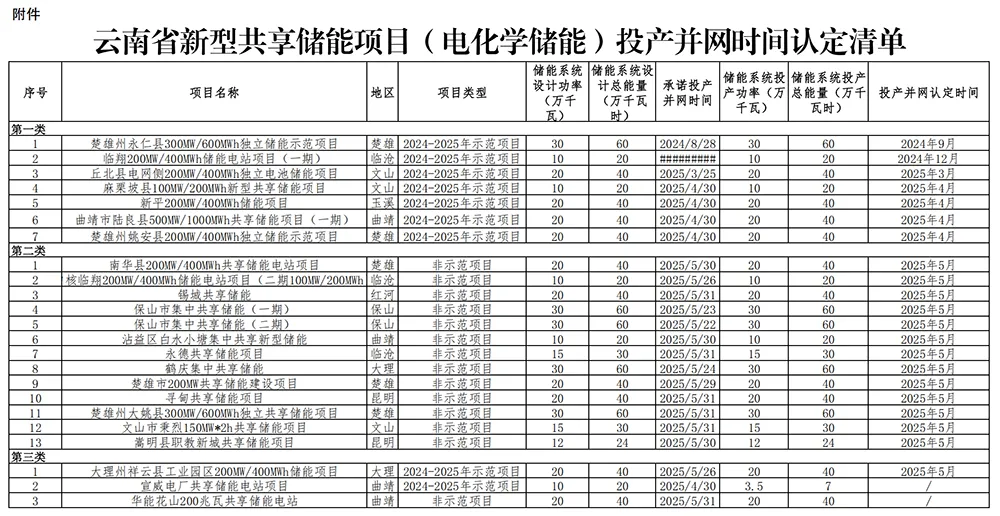 按照《云南省发展和改革委员会 云南省能源局关于印发〈云南省新型储能发展实施方案(2024—2025年)〉的通知》(云能源科技〔2024〕98号)(以下简称《实施方案》)、《云南省发展和改革委员会 云南省能源局关于进一步推进新型共享储能发展的通知》(云能源科技〔2025〕1号)、《云南省电化学储能项目投产并网时间技术认定指南(试行)》《云南省能源局关于开展新型共享储能项目(电化学储能)投产并网时间认定的通知》(云能源办科技〔2025〕136号)等要求,省能源局会同有关单位开展了新型共享储能项目(电化学储能)投产并网时间认定工作。