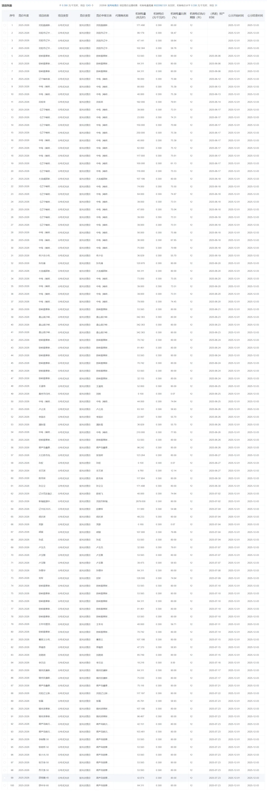 根据公示,2026年风电机制电量规模8022092.531兆瓦时,机制电价水平0.330元/千瓦时,项目31个。2026年光伏机制电量规模142818.117 兆瓦时,机制电价水平0.300元/千瓦时,项目1243个。
