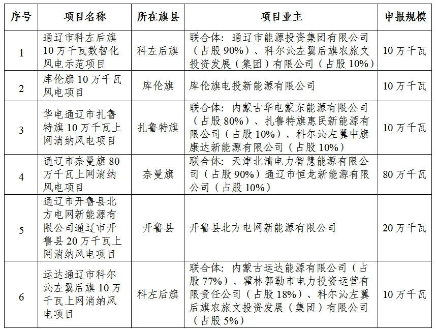 通辽市2025年竞争性配置上网消纳风电项目评审结果公示共6个风电项目,规模合计140万千瓦。