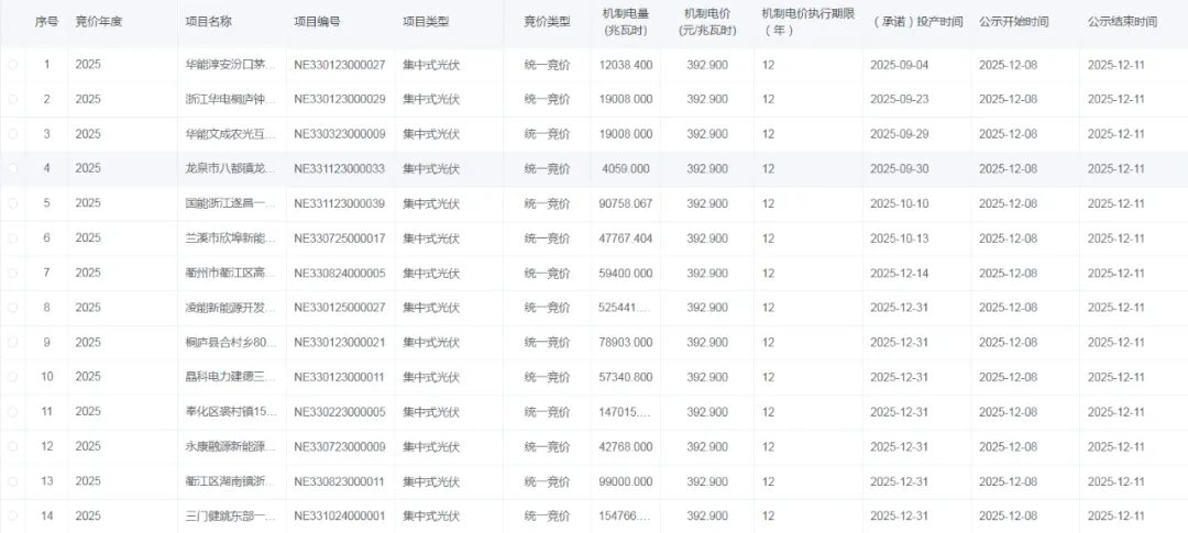 根据公示,浙江省2025年统一竞价项目竞价出清结果:机制电量规模1357273.500兆瓦时,机制电价水平:0.3929元/kWh,项目14个,执行期限为12年。