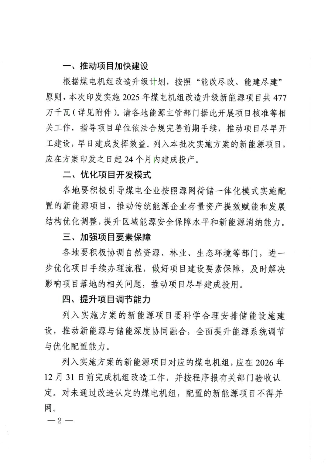 本次印发实施2025年煤电机组改造升级新能源项目共477万千瓦(文末附有项目清单),新能源项目要求在方案印发之日起24个月内建成投产。列入实施方案的新能源项目对应的煤电机组,应在2026年12月31日前完成机组改造工作,并按程序报有关部门验收认定。对未通过改造认定的煤电机组,配置的新能源项目不得并网。