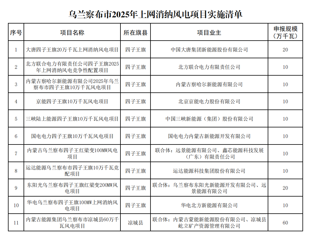 公示显示,乌兰察布市2025年上网消纳风电项目共11个,规模合计180万千瓦。