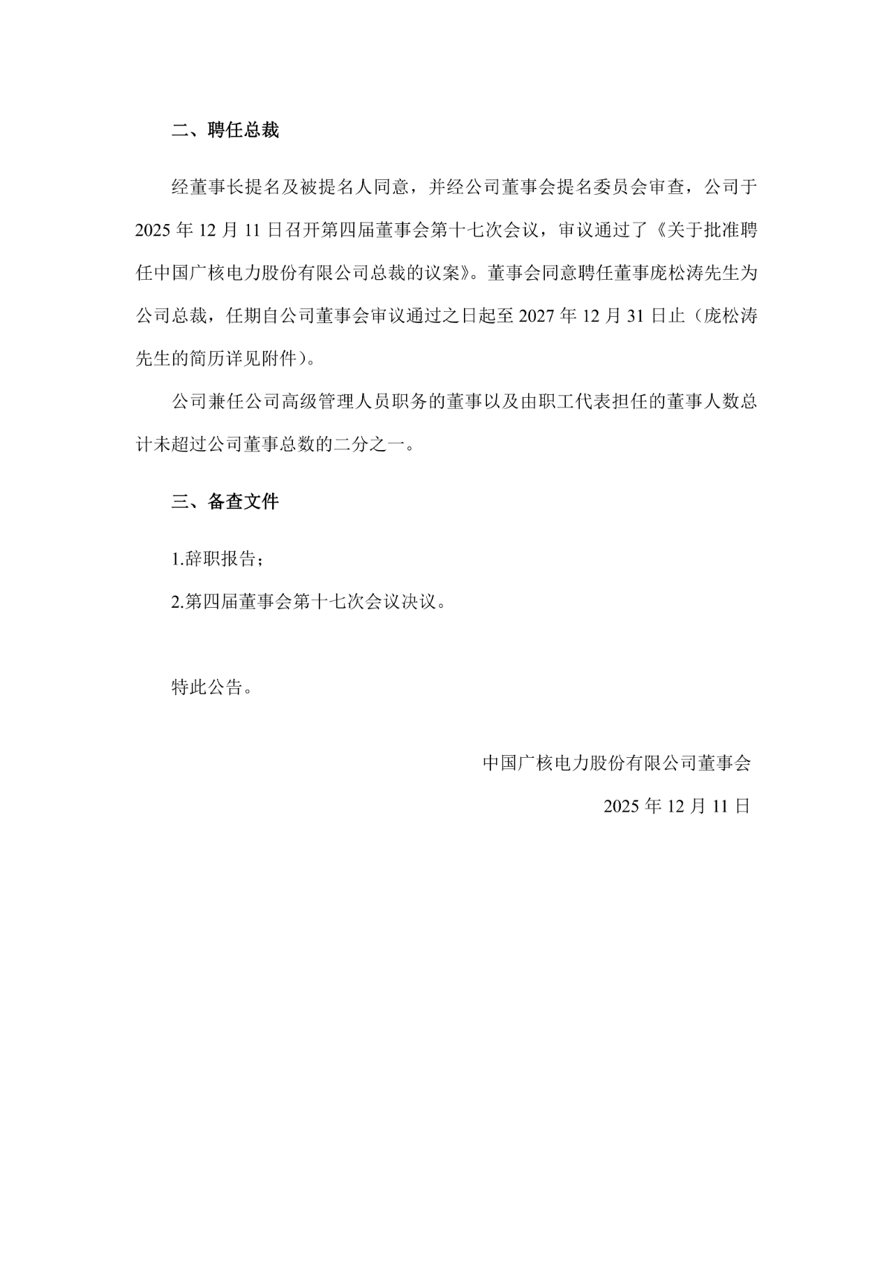 中国广核电力股份有限公司收到公司董事兼总裁高立刚先生的书面辞职报告,高立刚先生因到龄退休,辞去公司董事、董事会核安全委员会委员和公司总裁职务,辞任自辞职报告送达董事会时生效,辞任后高立刚先生不再担任公司任何职务。