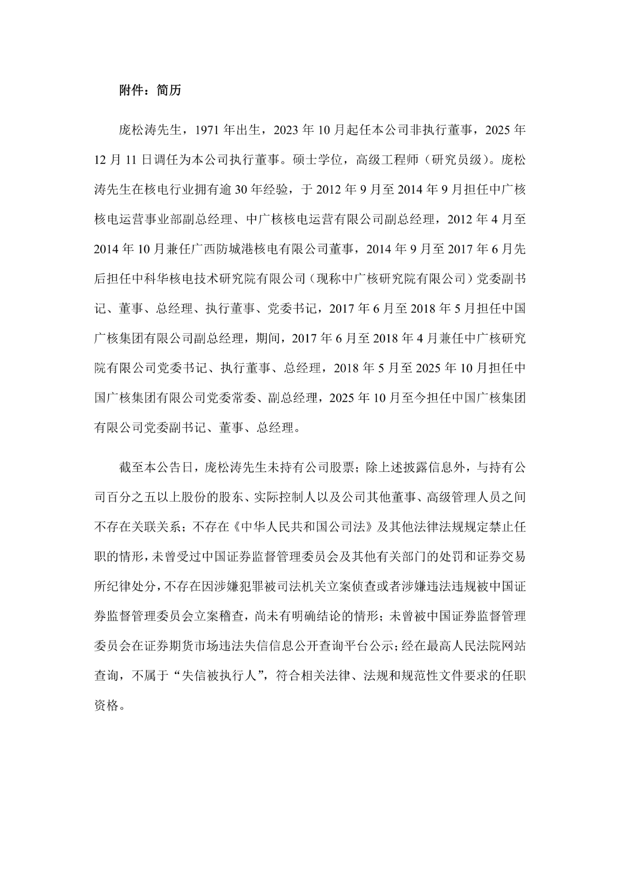 庞松涛先生在核电行业拥有逾30年经验,于2012年9月至2014年9月担任中广核核电运营事业部副总经理、中广核核电运营有限公司副总经理,2012年4月至2014年10月兼任广西防城港核电有限公司董事,2014年9月至2017年6月先后担任中科华核电技术研究院有限公司(现称中广核研究院有限公司)党委副书记、董事、总经理、执行董事、党委书记,2017年6月至2018年5月担任中国广核集团有限公司副总经理,期间,2017年6月至2018年4月兼任中广核研究院有限公司党委书记、执行董事、总经理,2018年5月至2025年10月担任中国广核集团有限公司党委常委、副总经理,2025年10月至今担任中国广核集团有限公司党委副书记、董事、总经理。