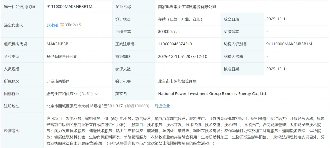 公开资料显示,国家电投集团生物质能源有限公司,主营业务为发电业务、输电业务、供(配)电业务;合同能源管理;太阳能发电技术服务;风力发电技术服务;储能技术服务;碳减排、碳转化、碳捕捉、碳封存技术研发等。