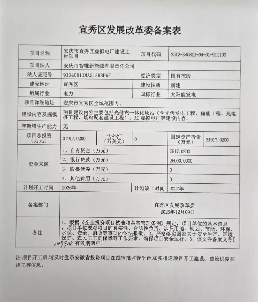 12月12日,安徽省安庆市宜秀区发展和改革委员会发布宜秀区虚拟电厂建设工程项目备案表。