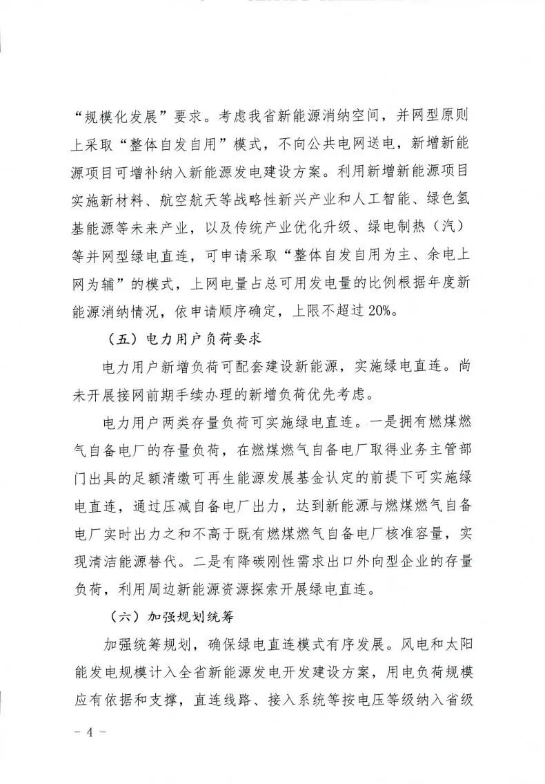 利用新增新能源项目实施新材料、航空航天等战略性新兴产业和人工智能、绿色氢基能源等未来产业,以及传统产业优化升级、绿电制热(汽)等并网型绿电直连,可申请采取“整体自发自用为主、余电上网为辅”的模式,上网电量占总可用发电量的比例根据年度新能源消纳情况,依申请顺序确定,上限不超过20%。