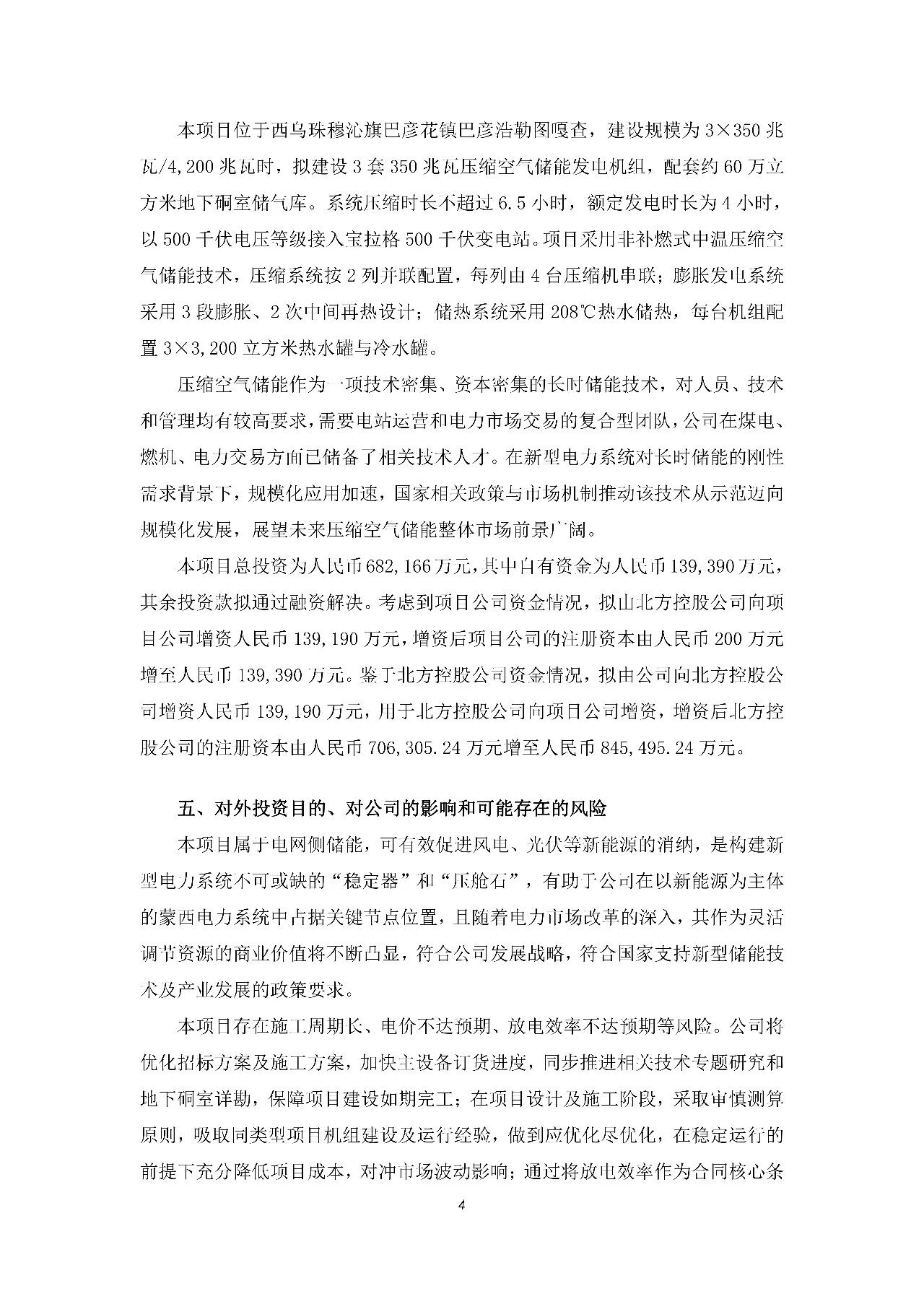 本项目总投资为人民币682,166万元,其中自有资金为人民币139,390万元,其余投资款拟通过融资解决。考虑到项目公司资金情况,拟由北方控股公司向项目公司增资人民币139,190万元,增资后项目公司的注册资本由人民币200万元增至人民币139,390万元。鉴于北方控股公司资金情况,拟由公司向北方控股公司增资人民币139,190万元,用于北方控股公司向项目公司增资,增资后北方控股公司的注册资本由人民币706,305.24万元增至人民币845,495.24万元。