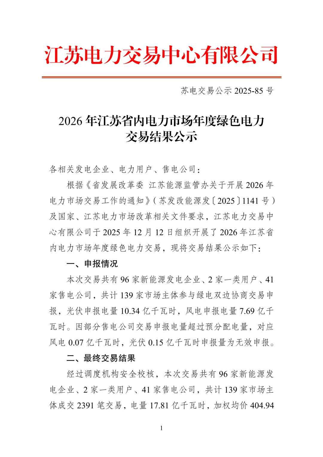 绿电交易方面,根据公告,2026年,江苏绿电交易电量为17.81亿千瓦时,加权均价404.94元/兆瓦时,其中绿色电力环境均价21.71元/兆瓦时。其中: