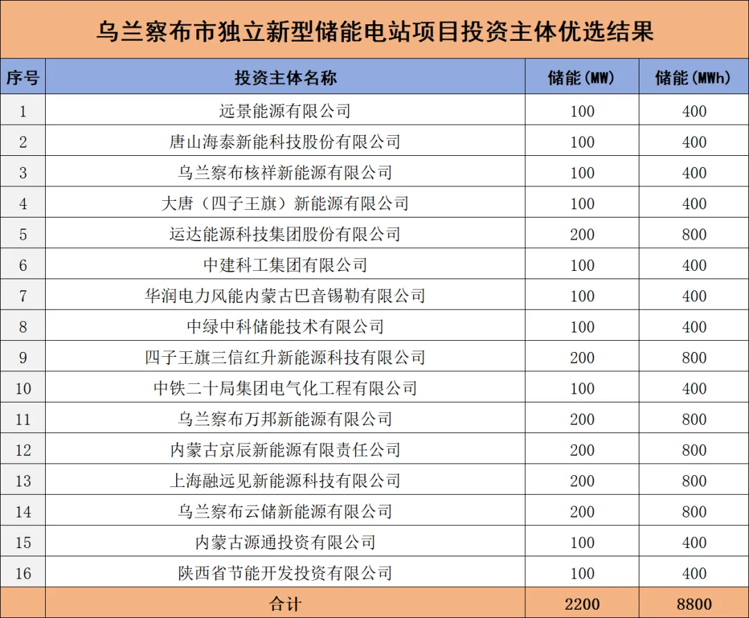 1月12日,乌兰察布市独立新型储能电站项目投资主体优选结果公示。