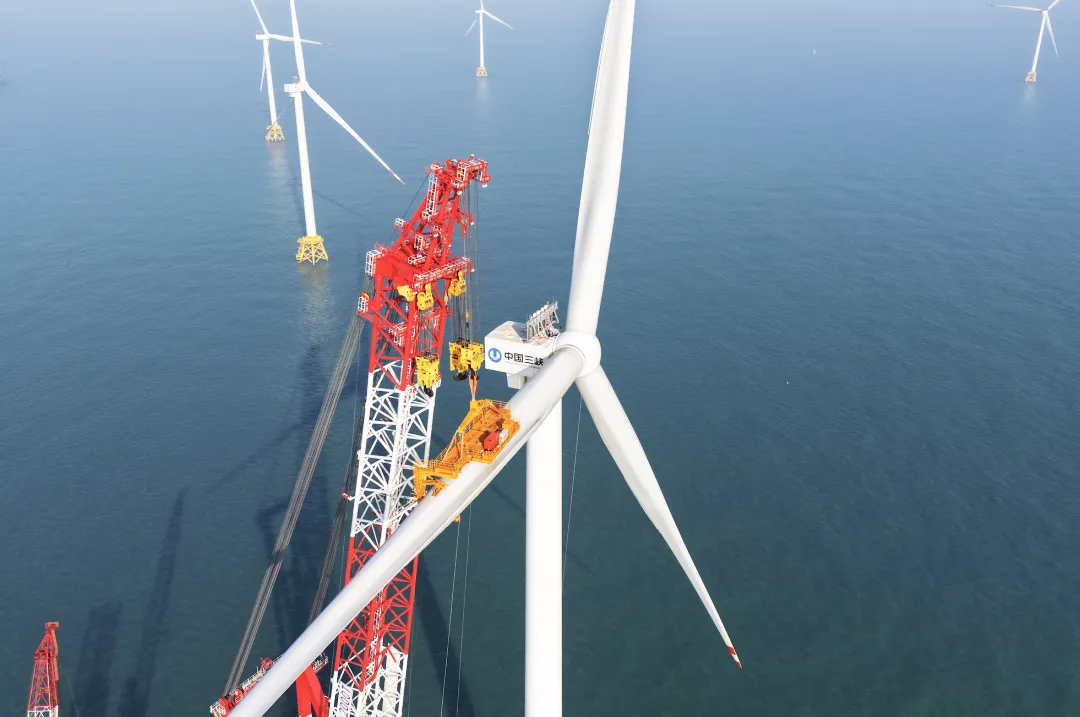 ▲在大型起重装备的操控下,风机第三支叶片与机舱轮毂精准对接并完成螺栓紧固,标志着全球首台20兆瓦海上风电机组吊装作业顺利完成。(三峡集团福建分公司供图)