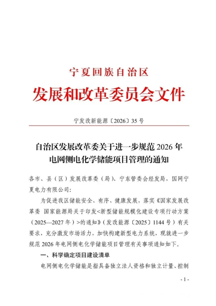 1月20日,宁夏回族自治区发改委发布《自治区发展改革委关于进一步规范2026年电网侧电化学储能项目管理的通知》。