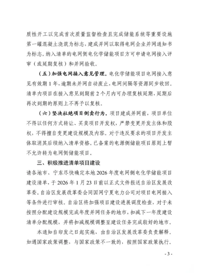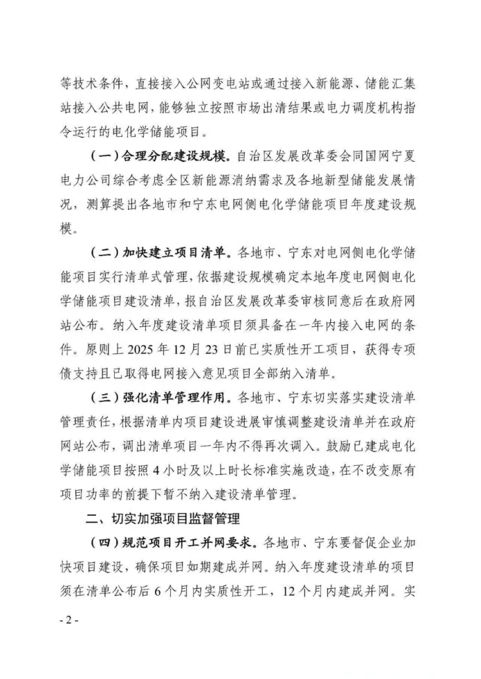 通知指出,加快建立项目清单。各地市、宁东对电网侧电化学储能项目实行清单式管理。纳入年度建设清单项目须具备在一年内接入电网的条件。原则上2025年12月23日前已实质性开工项目,获得专项债支持且已取得电网接入意见项目全部纳入清单。