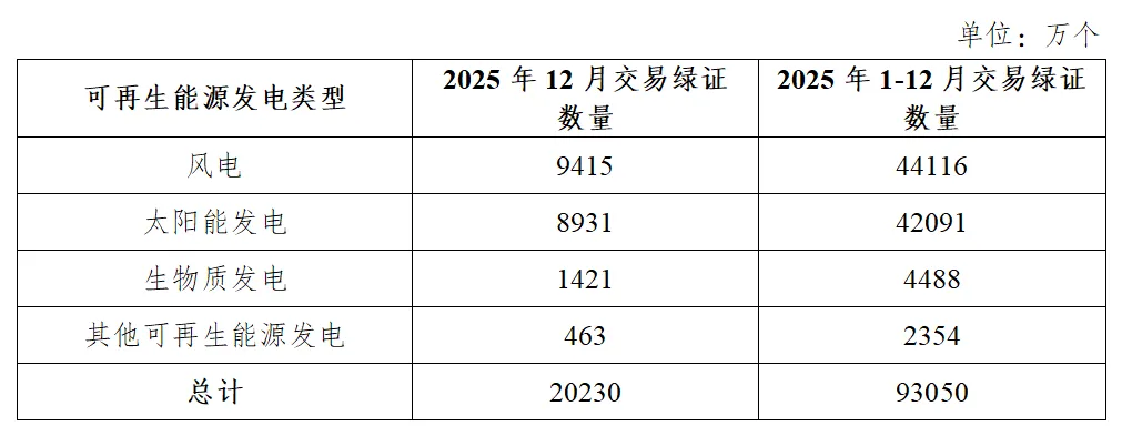 2025年12月,全国交易绿证2.02亿个,其中绿色电力交易绿证2275万个。2025年1-12月,全国共计交易绿证9.30亿个,其中绿色电力交易绿证2.50亿个。