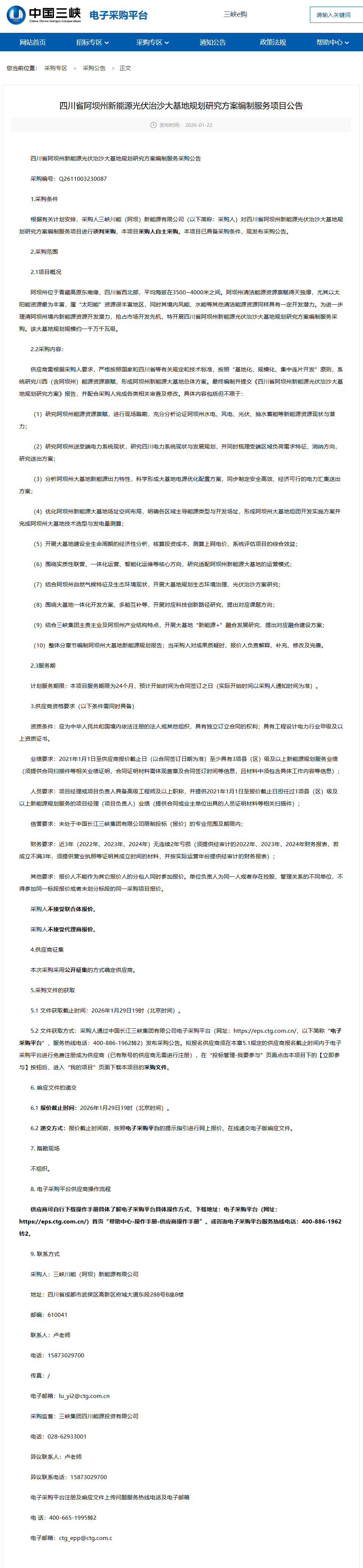 1月22日,四川省阿坝州新能源光伏治沙大基地规划研究方案编制服务项目公告发布。