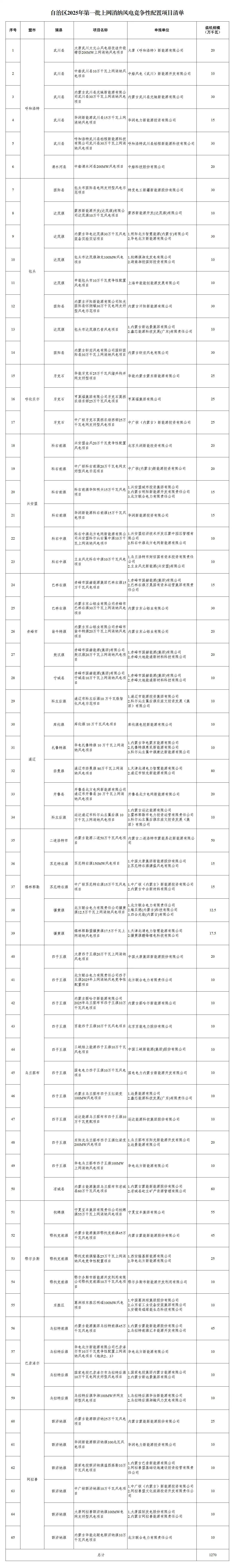 公告显示,2025年第一批上网消纳风电项目共65个,容量总计1270万千瓦。