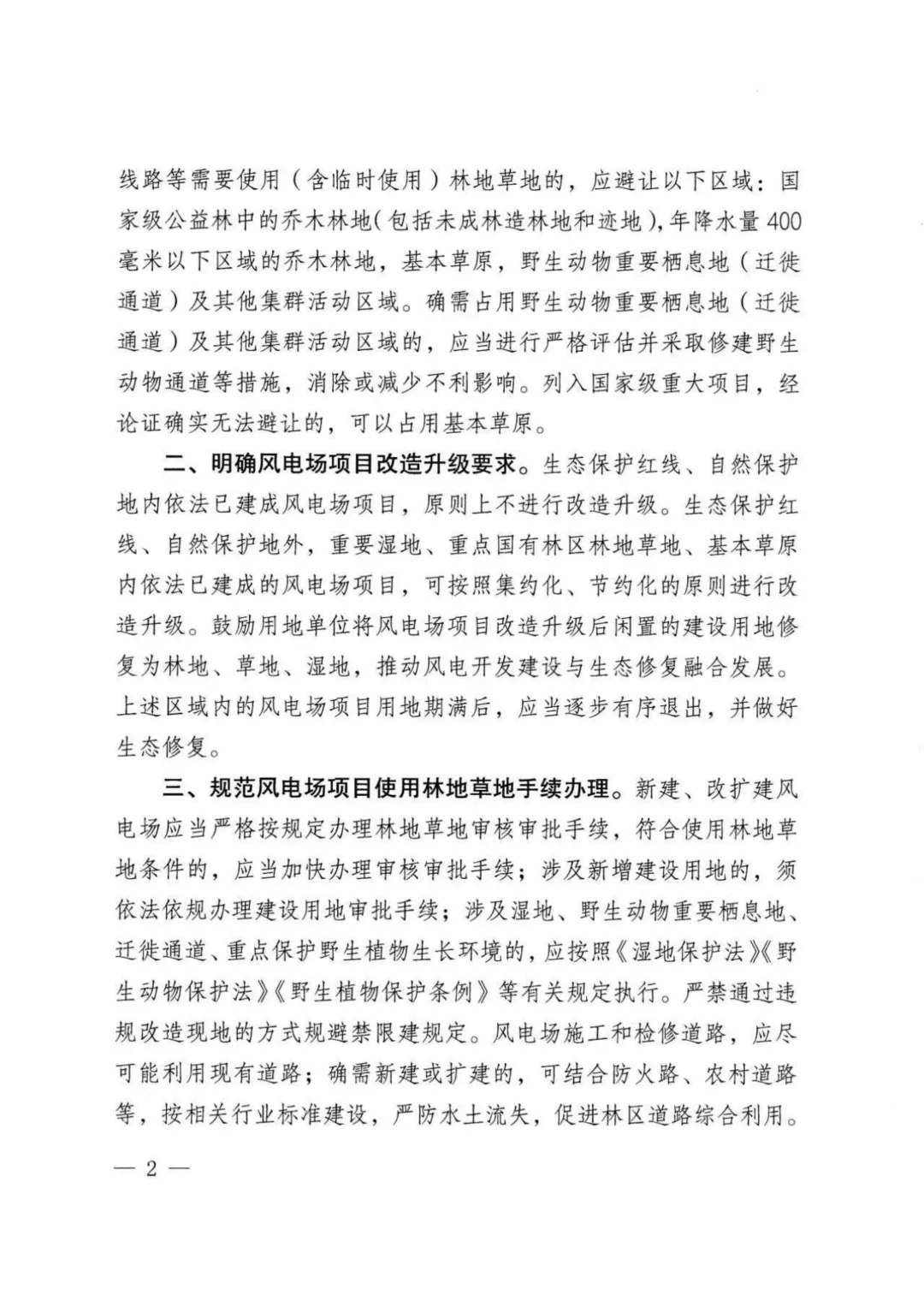 新建、改扩建风电场应当严格按规定办理林地草地审核审批手续,符合使用林地草地条件的,应当加快办理审核审批手续;涉及新增建设用地的,须依法依规办理建设用地审批手续;涉及湿地、野生动物重要栖息地、迁徙通道、重点保护野生植物生长环境的,应按照《湿地保护法《野生动物保护法》《野生植物保护条例》等有关规定执行。严禁通过违规改造现地的方式规避禁限建规定。