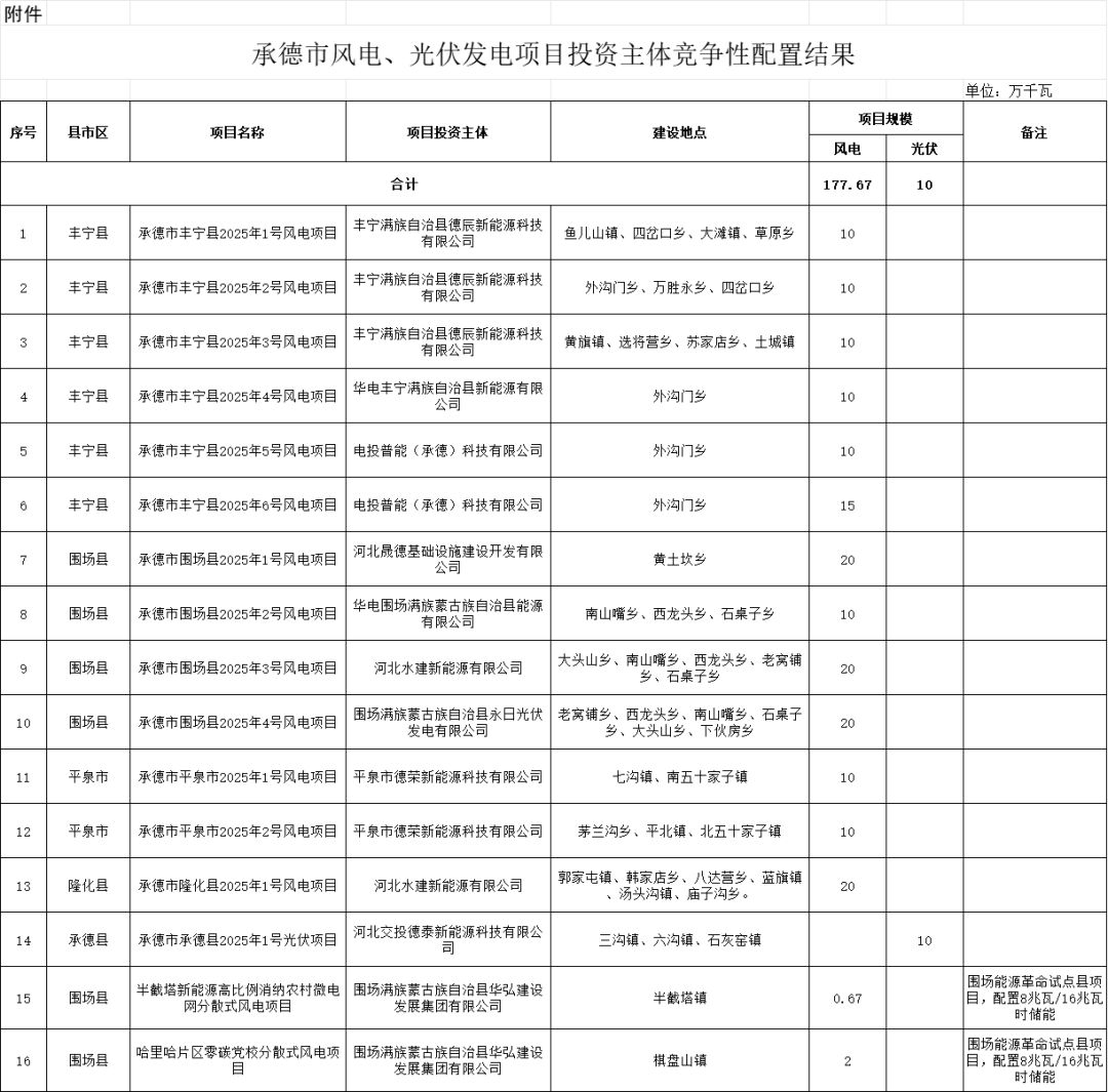 附件:承德市风电、光伏发电项目投资主体竞争性配置结果