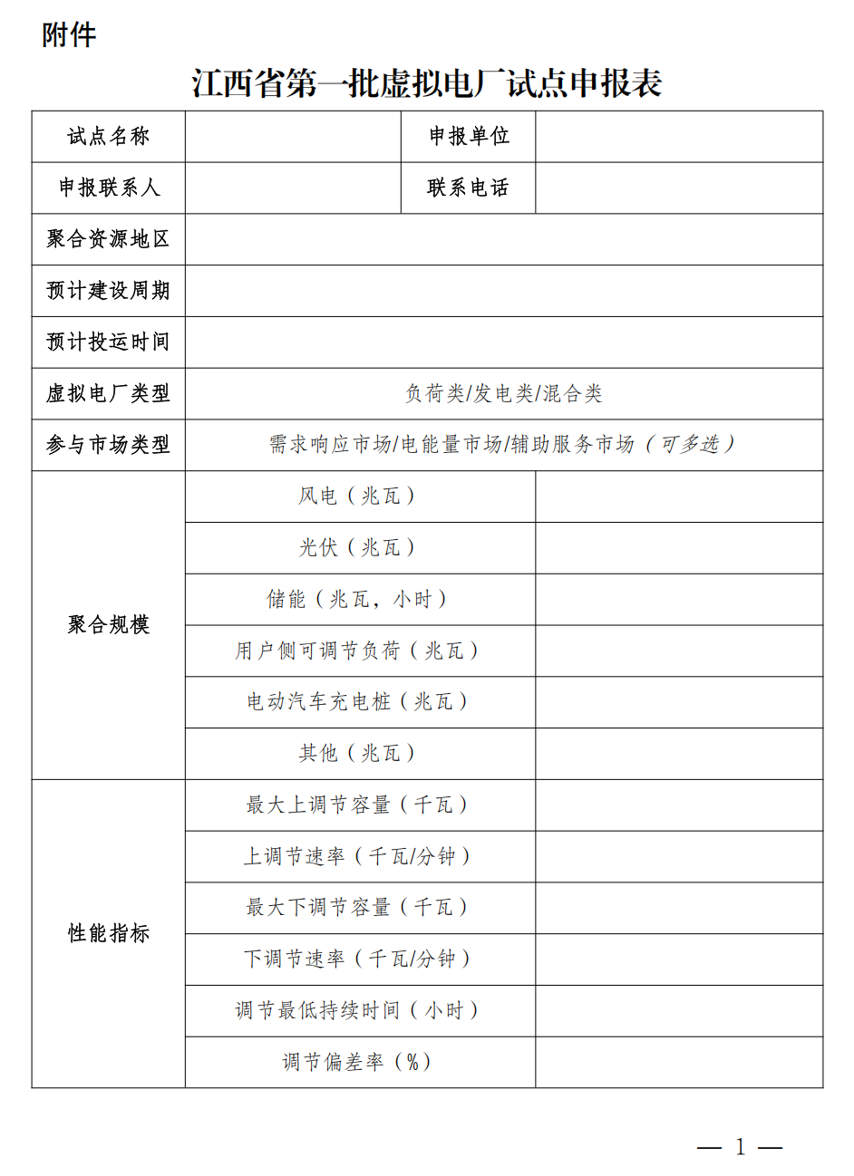 为加快推动我省虚拟电厂发展,发挥虚拟电厂在供应保障、运行调节、新能源消纳等方面的积极作用,根据《江西省推动虚拟电厂高质量发展工作方案》《江西省虚拟电厂建设运营工作指南》等文件要求,决定在全省范围内组织开展第一批虚拟电厂试点申报工作。有关事项通知如下: