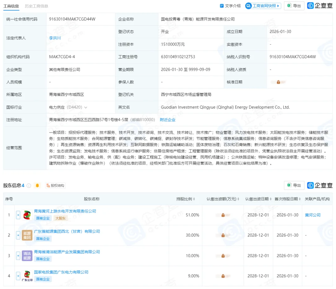 2026年1月30日,国电投青粤(青海)能源开发有限责任公司注册成立。公司注册资本1510000万元,由青海黄河上游水电开发有限责任公司持股51.00%、广东省能源集团西北(甘肃)有限公司持股30.00%、青海省清洁能源产业发展集团有限公司持股10.00%、国家电投集团广东电力有限公司持股9.00%。其中,青海黄河上游水电开发有限责任公司和国家电投集团广东电力有限公司为国家电投集团二级单位,广东省能源集团西北(甘肃)有限公司和青海省清洁能源产业发展集团有限公司为省属国有能源集团企业。