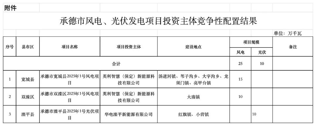 根据公示,河北省发改委2026年1月19日发布补充纳入2025年河北省风电光伏项目竞配清单的项目完成了投资主体竞争性配置工作,共3个风、光项目,规模合计35万千瓦。