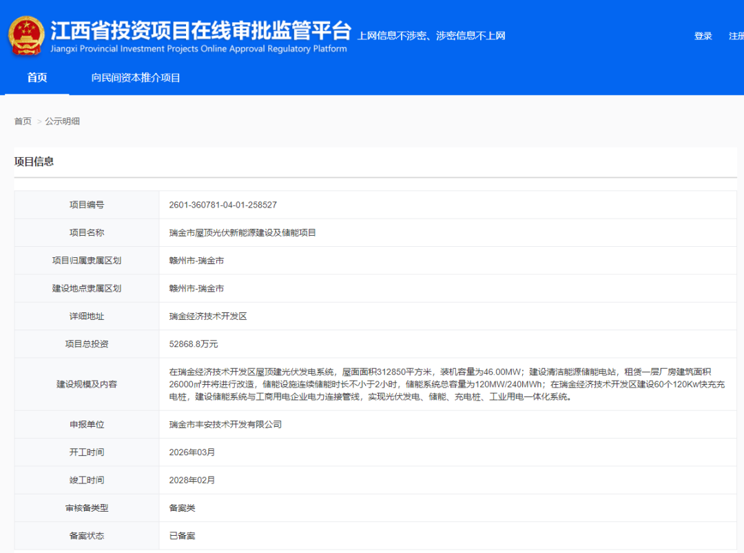 根据公示信息显示,项目位于瑞金经济技术开发区,项目总投资52868.8万元。在瑞金经济技术开发区屋顶建光伏发电系统,屋面面积312850平方米,装机容量为46.00MW;建设清洁能源储能电站,租赁一层厂房建筑面积26000㎡并将进行改造,储能设施连续储能时长不小于2小时,储能系统总容量为120MW/240MWh;在瑞金经济技术开发区建设60个120Kw快充充电桩,建设储能系统与工商用电企业电力连接管线,实现光伏发电、储能、充电桩、工业用电一体化系统。