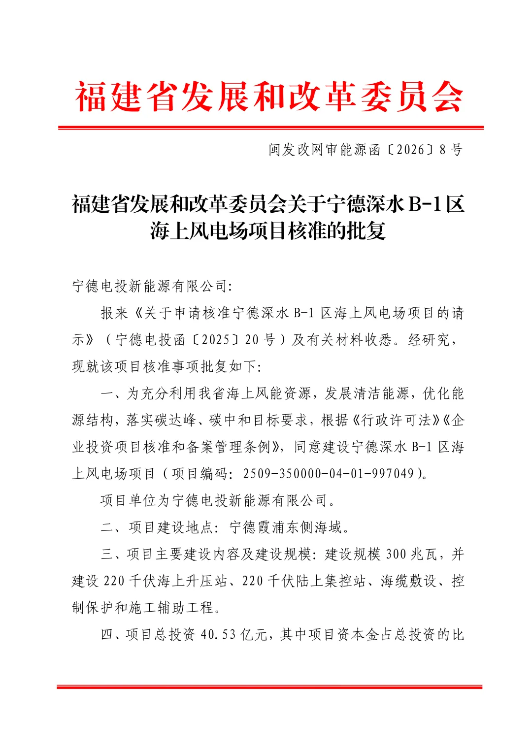 2月5日,国家电投福建公司宁德深水B-1区30万千瓦海上风电项目获得福建省发展和改革委员会核准批复。