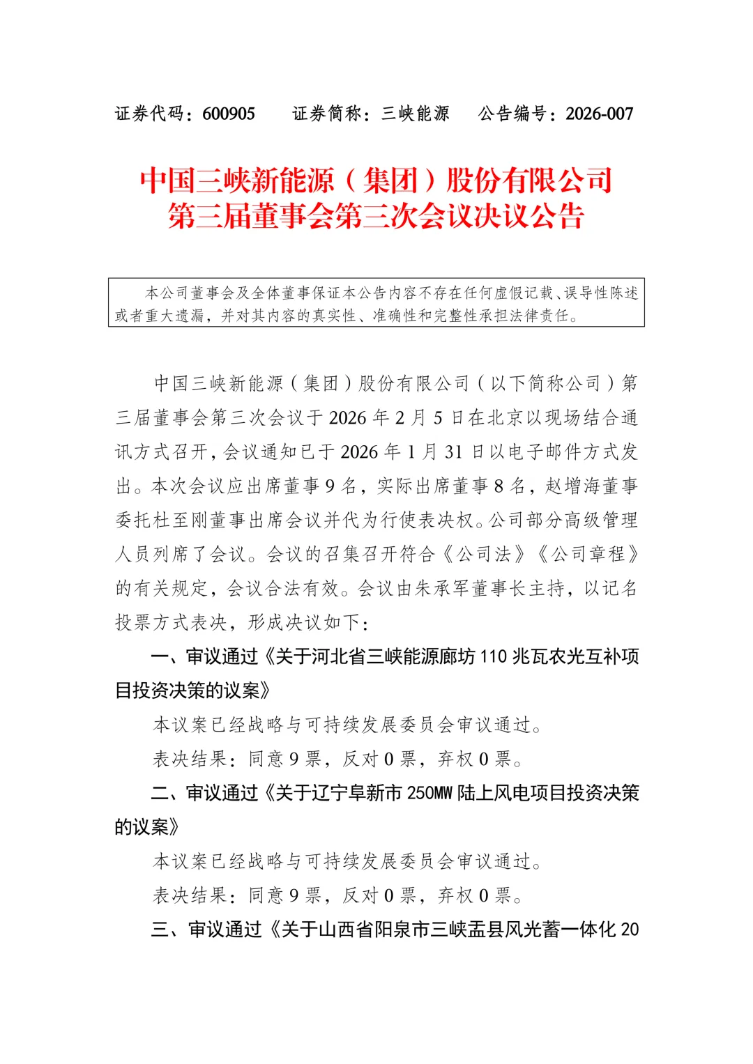 2月6日,三峡能源发布《中国三峡新能源(集团)股份有限公司第三届董事会第三次会议决议公告》,共560MW风、光项目通过投资决策。