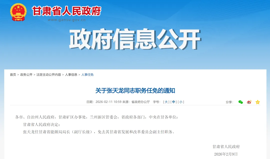 2月11日,据甘肃省人民政府消息,张天龙任甘肃省能源局局长(副厅长级),免去其甘肃省发展和改革委员会副主任职务。