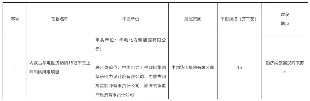 根据公示,内蒙古阿拉善盟15万千瓦上网消纳风电项目牵头单位为华电北方新能源有限公司,联合体单位为中国电力工程顾问集团华东电力设计院有限公司、内蒙古阿拉善能源有限责任公司、额济纳旗能产投资有限责任公司。