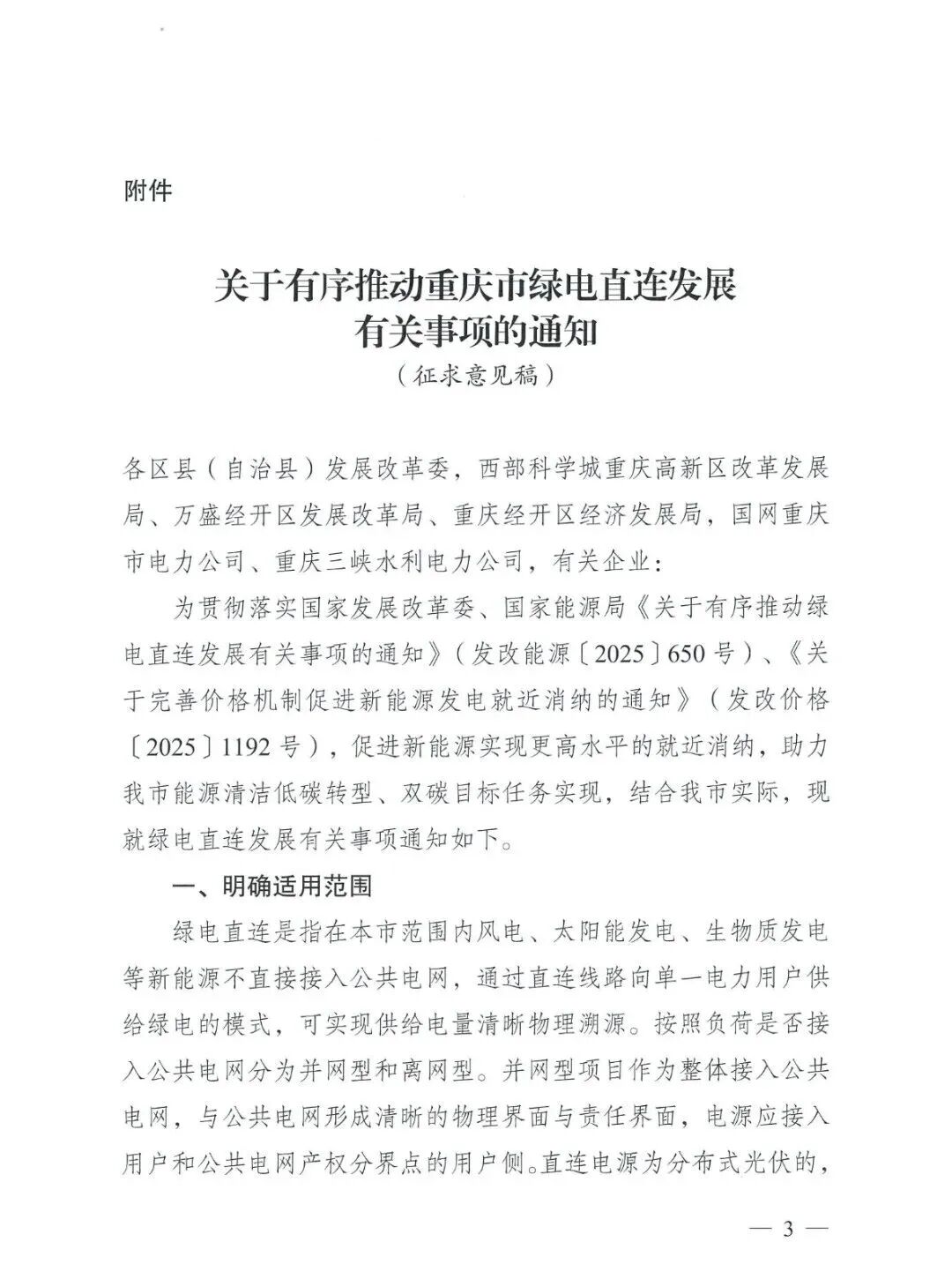 近日,重庆市能源局发布关于征求《关于有序推动重庆市绿电直连发展有关事项的通知(征求意见稿)》意见的函。文件指出,四大类型建设绿电直连项目: