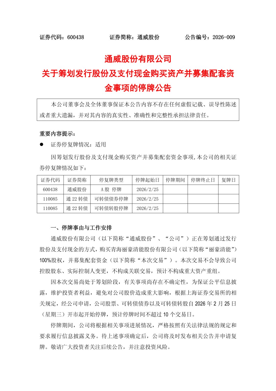 2月24日晚间,通威股份发布《关于筹划发行股份及支付现金购买资产并募集配套资金事项的停牌公告》,拟收购青海丽豪清能股份有限公司。