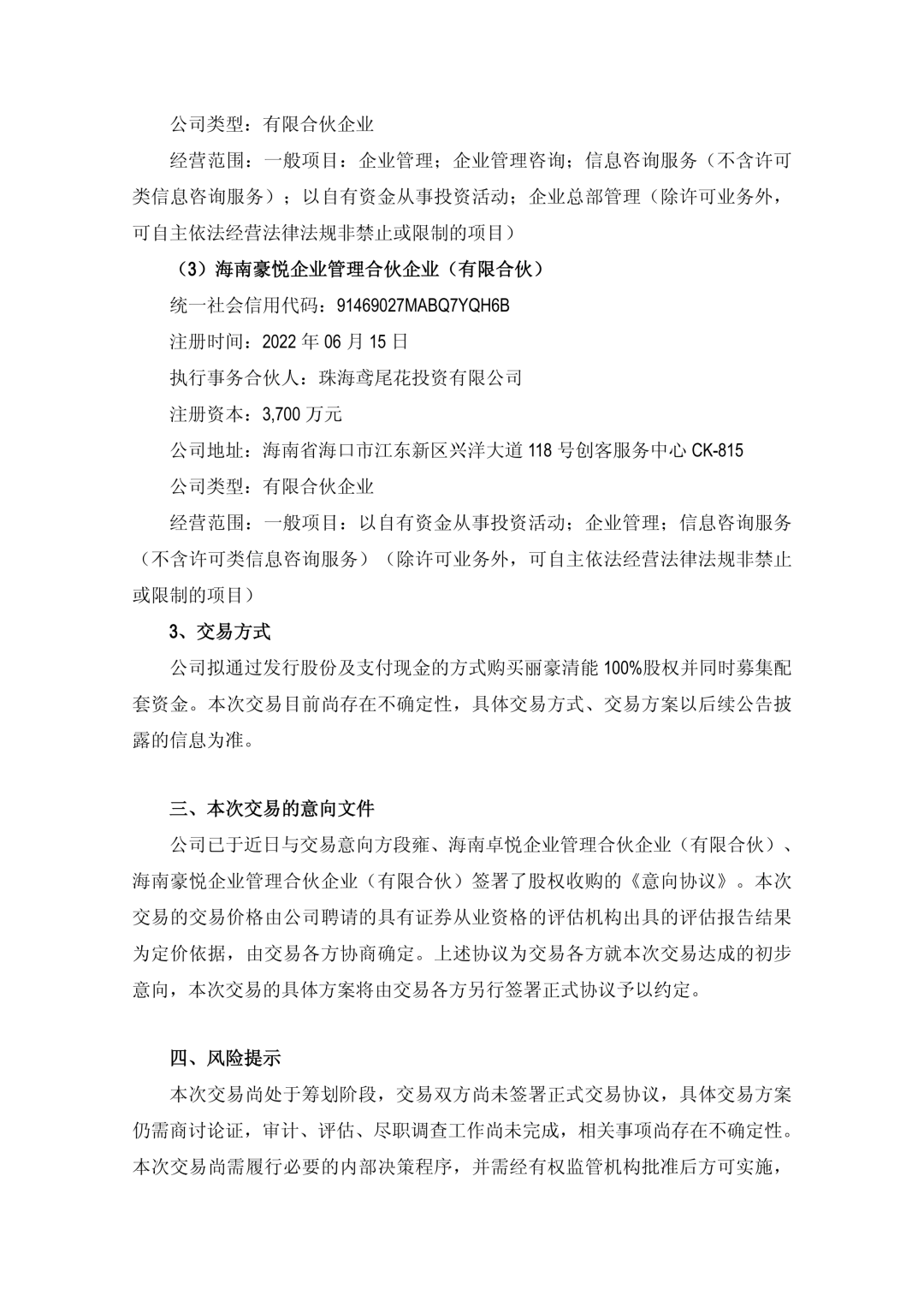 已于近日与交易意向方段雍、海南卓悦企业管理合伙企业(有限合伙)、海南豪悦企业管理合伙企业(有限合伙)签署了股权收购的《意向协议》。