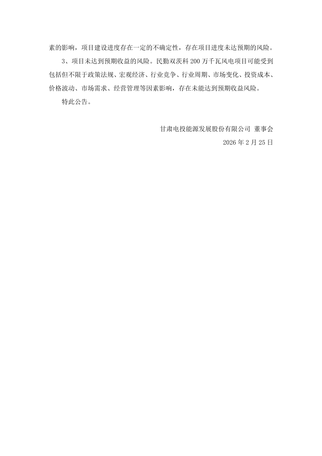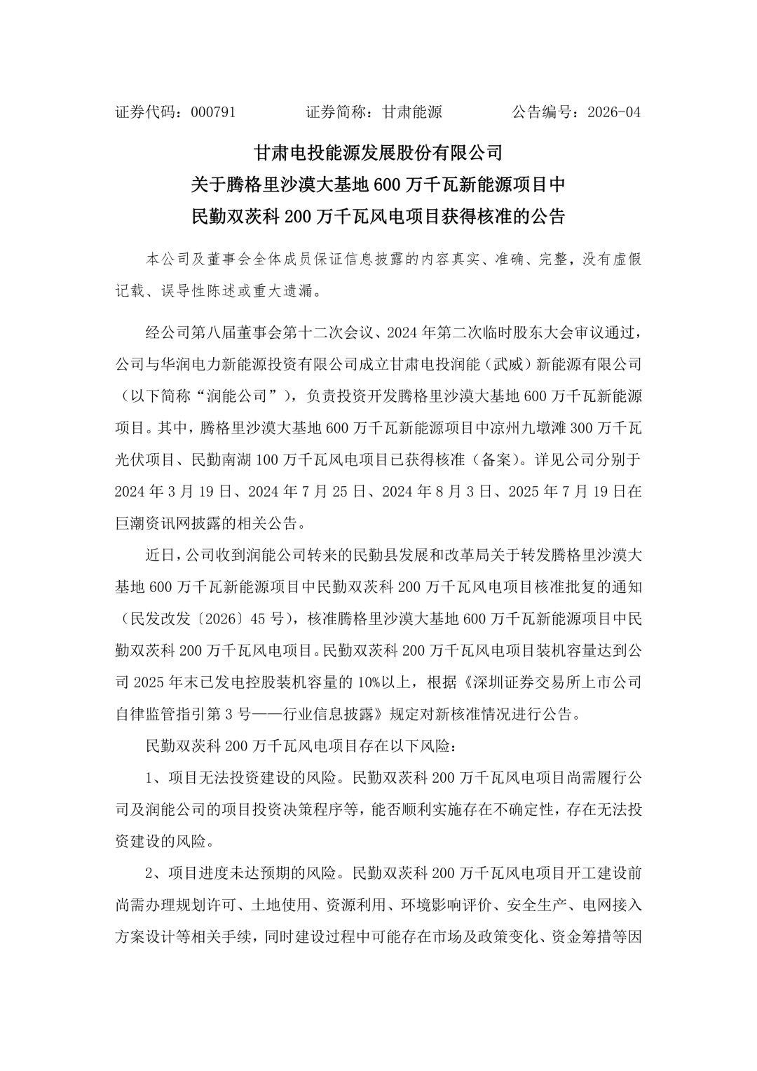 甘肃电投能源发展股份有限公司(简称:甘肃能源)2月24日公告称,近日,公司收到润能公司转来的民勤县发展和改革局关于转发腾格里沙漠大基地600万千瓦新能源项目中民勤双茨科200万千瓦风电项目核准批复的通知,核准腾格里沙漠大基地600万千瓦新能源项目中民勤双茨科200万千瓦风电项目。