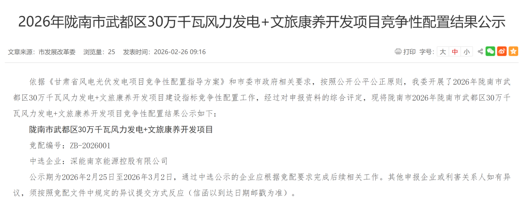 2月26日,2026年陇南市武都区30万千瓦风力发电+文旅康养开发项目竞争性配置结果公示,深能南京能源控股有限公司中选。