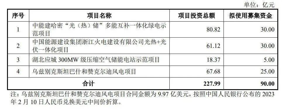 本次发行的募集资金拟投资于中能建哈密“光(热)储”多能互补一体化绿电示范项目、中国能源建设集团浙江火电建设有限公司光热+光伏一体化项目、湖北应城300MW级压缩空气储能电站示范项目和乌兹别克斯坦巴什和赞克尔迪风电项目。