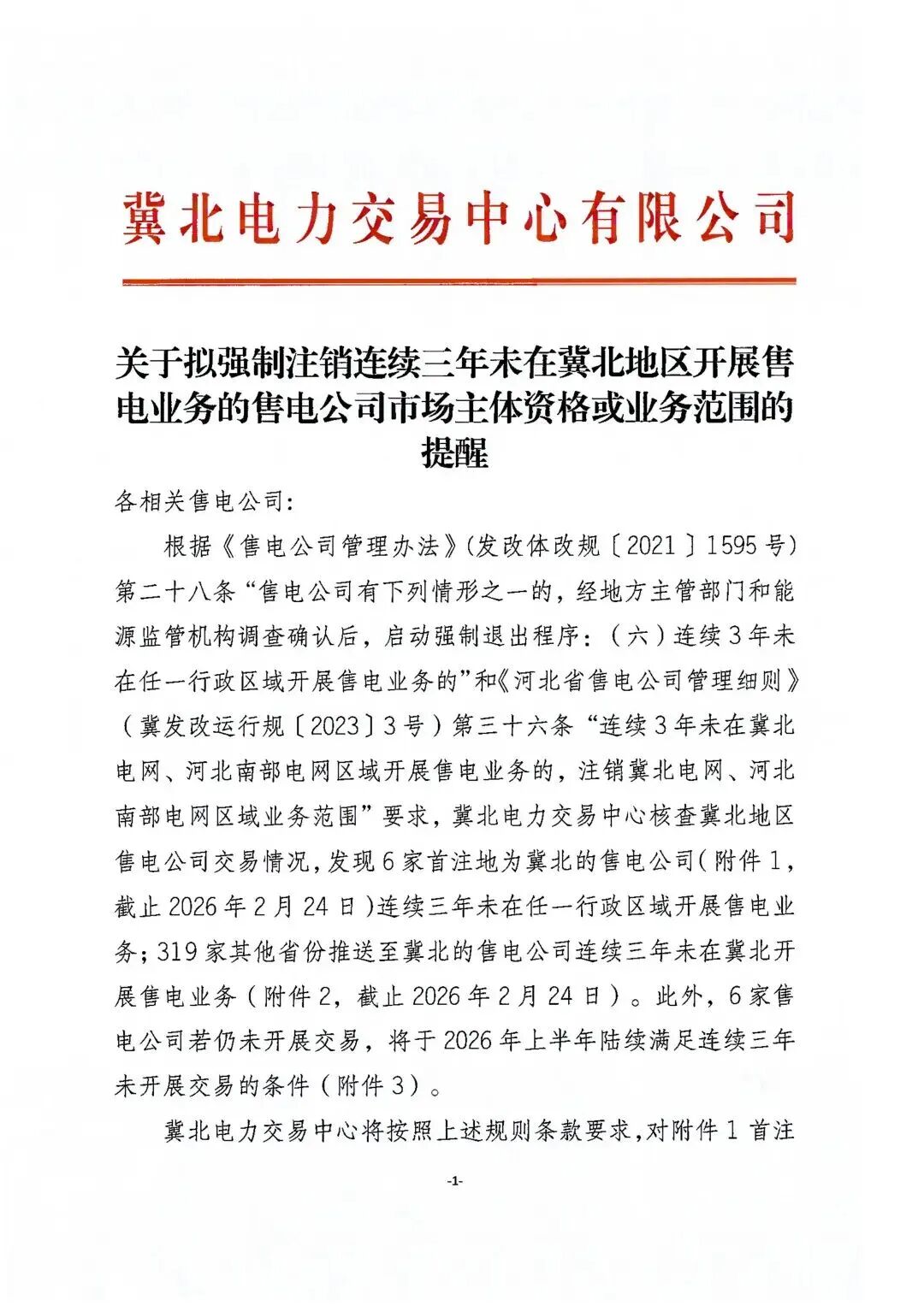 近日,冀北电力交易中心发布关于拟强制注销连续三年未在冀北地区开展售电业务的售电公司市场主体资格或业务范围的提醒。