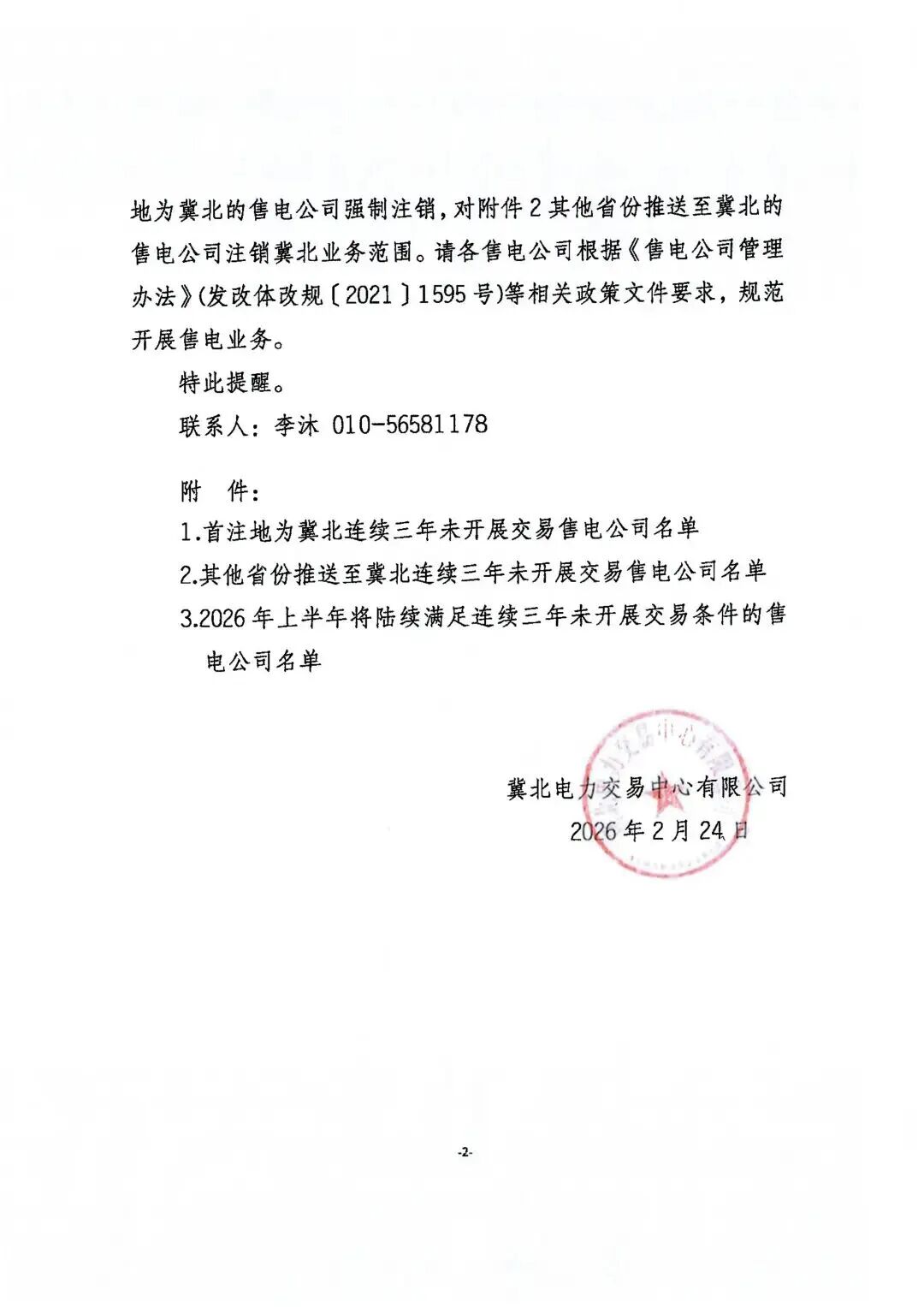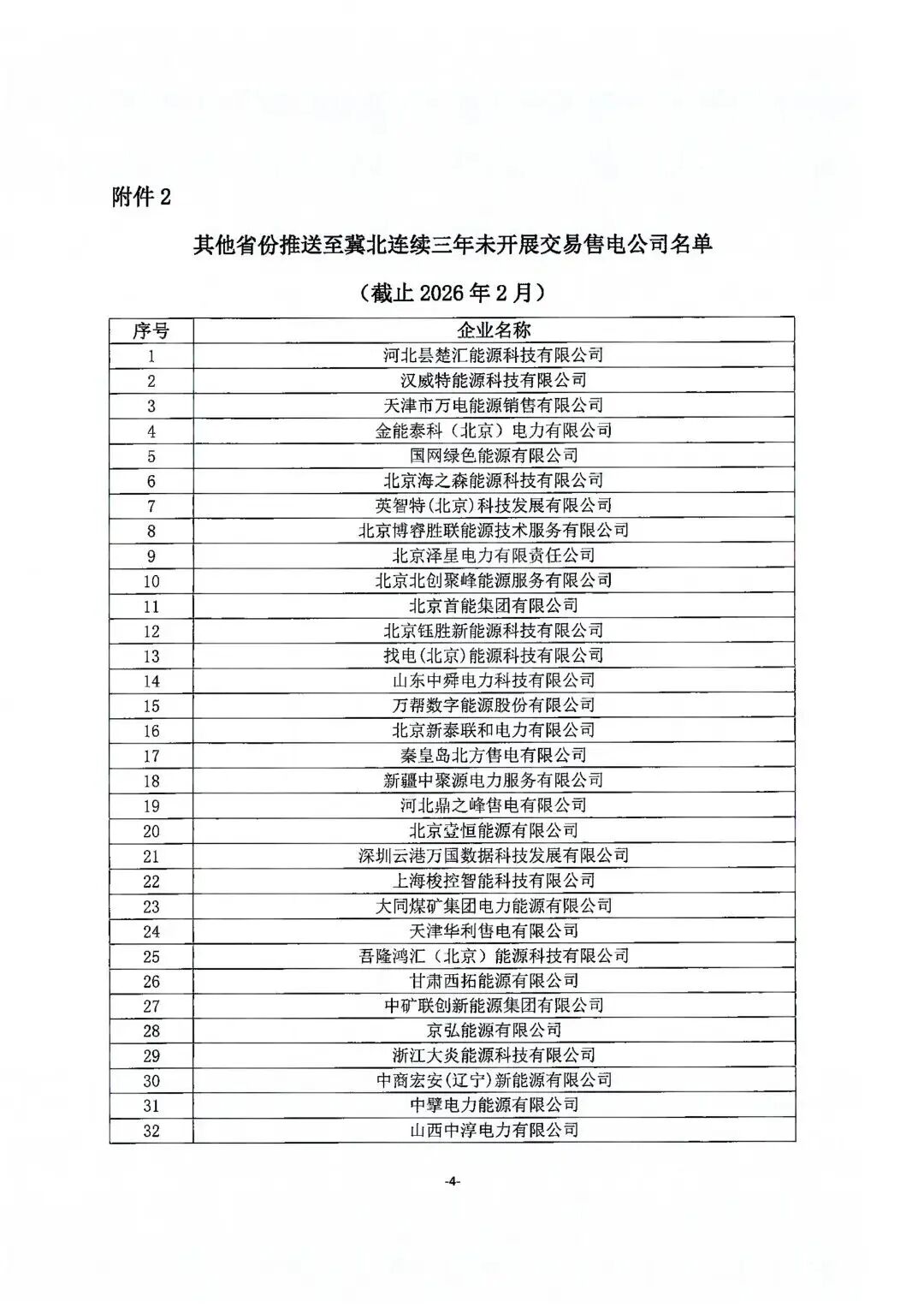 冀北电力交易中心核查冀北地区售电公司交易情况,发现6家首注地为冀北的售电公司(附件1,截止2026年2月24日)连续三年未在任一行政区域开展售电业务;319家其他省份推送至冀北的售电公司连续三年未在冀北开展售电业务(附件2,截止2026年2月24日)。