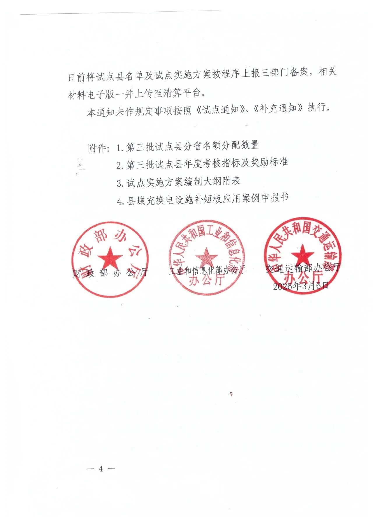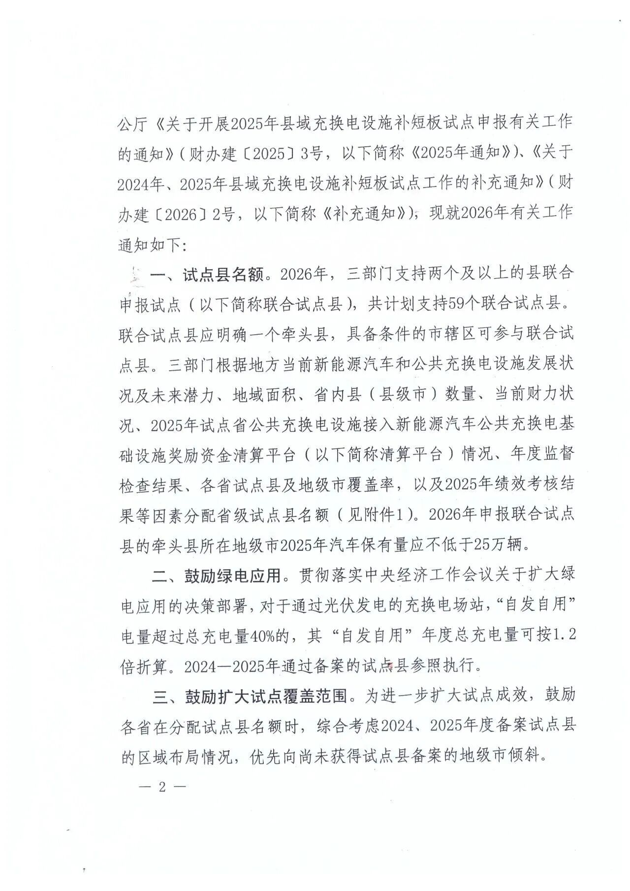3月6日,财政部、工信部、交通运输部联合印发《关于开展2026年县域充换电设施补短板试点申报有关工作的通知》(财办建〔2026〕8号),正式启动第三批试点工作,3月18日截止申报。