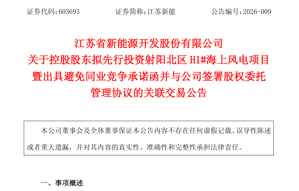 3月7日,江苏省新能源开发股份有限公司(以下简称“江苏新能”或“公司”)发布《关于控股股东拟先行投资射阳北区H1#海上风电项目暨出具避免同业竞争承诺函并与公司签署股权委托管理协议的关联交易公告》。