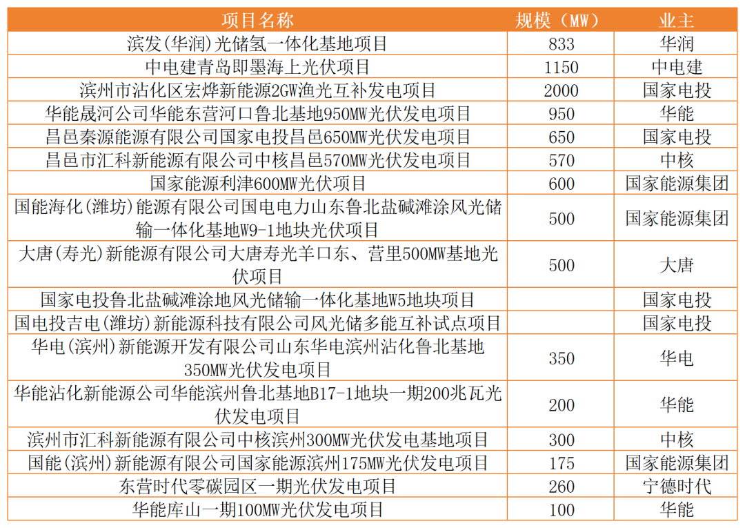 其中,国家电投、国家能源集团以及华能等入围项目较多,其次中核、华电、华润、中电建也有项目入围。从项目名称来看,入围的项目主要为鲁北盐碱滩涂地的风、光大基地项目。