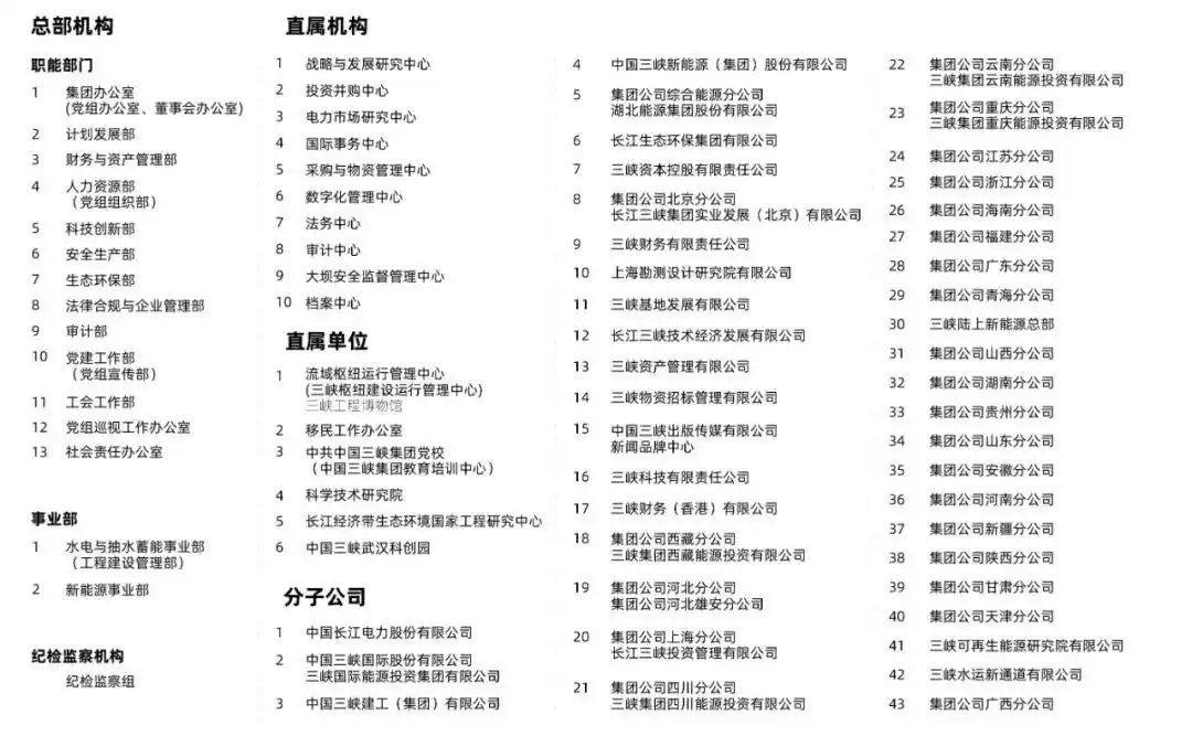 分子公司的布局也进一步完善,此次新增了集团公司东北分公司,填补了区域能源业务布局的空白,助力全国清洁能源网络的搭建;同时对原有分子公司进行规范调整,三峡水运新通道有限公司更名为三峡水运新通道(湖北)有限公司,优化了地域业务的标识和管理归属。其余四十余家核心分子公司和区域分公司职能保持稳定,长江电力、三峡新能源、长江生态环保集团等核心板块,继续发挥着主业支撑的关键作用。
