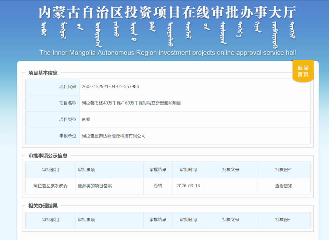 3月16日,内蒙古自治区投资项目在线审批办事大厅相关信息显示,阿拉善盟御达新能源科技有限公司提交的阿拉善恩格40万千瓦/160万千瓦时独立新型储能项目,符合产业政策和市场准入标准,准予备案。
